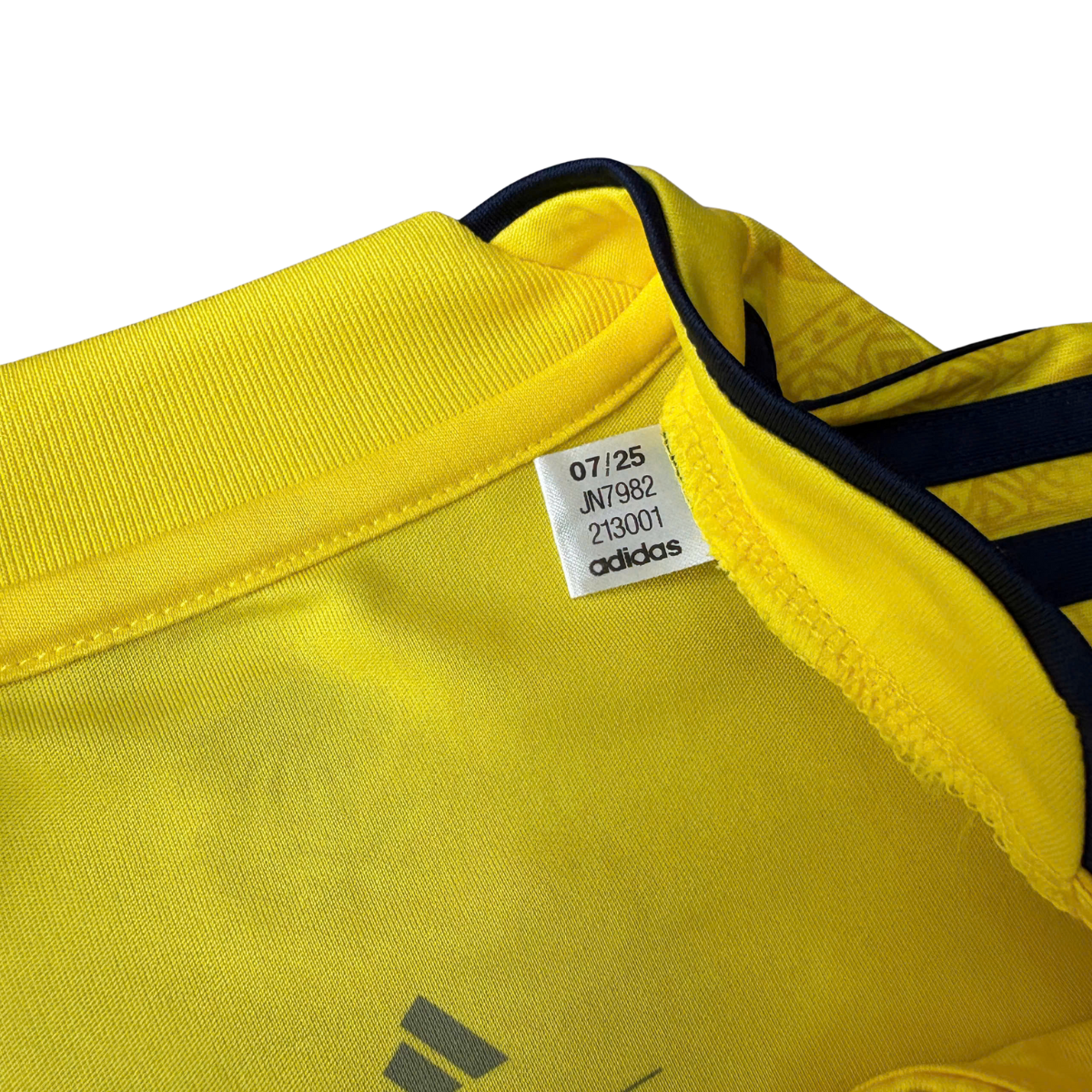 - Logo adidas, chi tiết viền & viền bên áo dùng tông xanh đậm, phối màu tương phản để nổi bật trên nền vàng