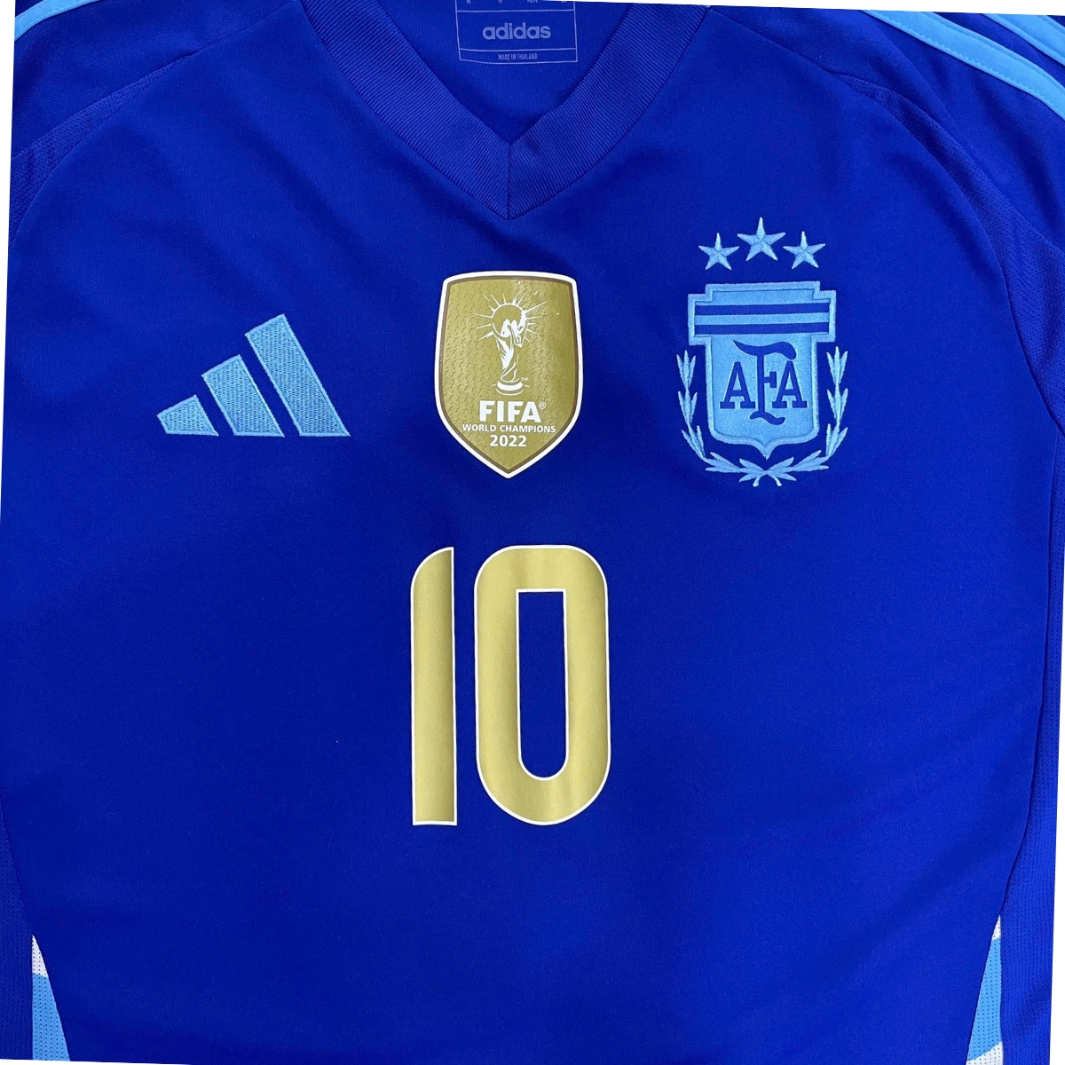 Biểu tượng Sun of May phía sau cổ áo nhấn mạnh niềm tự hào dân tộc và lịch sử đội tuyển.