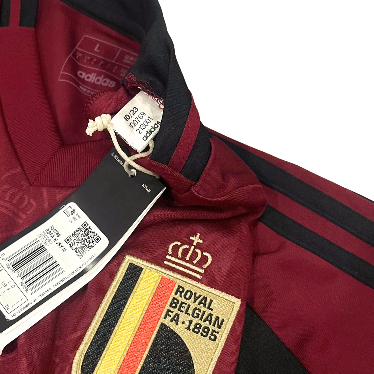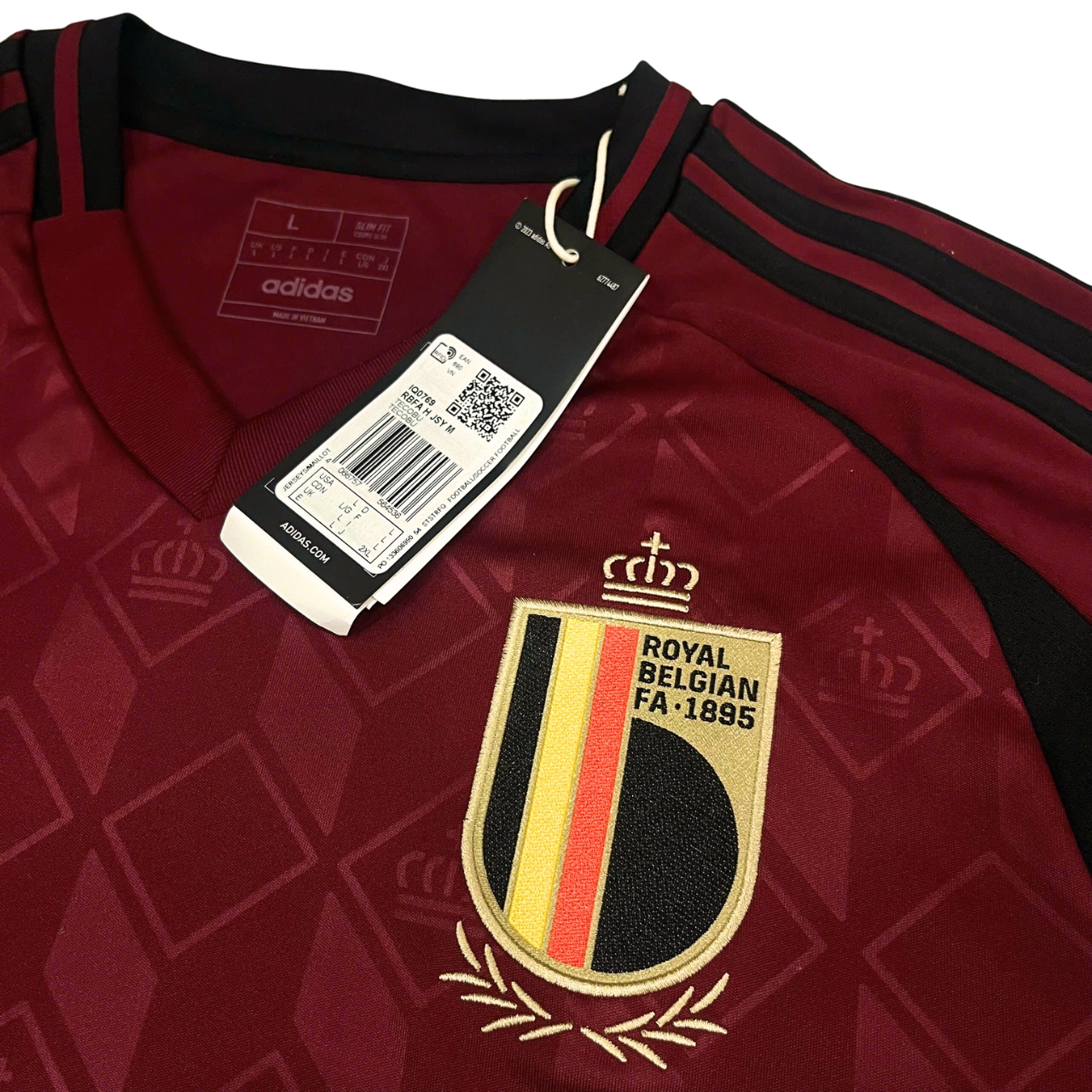 • Logo tuyển Bỉ & dòng chữ “1895” sau cổ áo: Khẳng định niềm tự hào quốc gia và truyền thống bóng đá lâu đời.