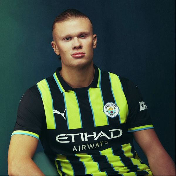 • Thiết kế kỷ niệm & cảm hứng lịch sử: Mẫu áo sân khách 2024/25 của Manchester City lấy cảm hứng từ mẫu áo 1998-99 với sọc navy và neon yellow, được hãng PUMA tái hiện lại chi tiết.