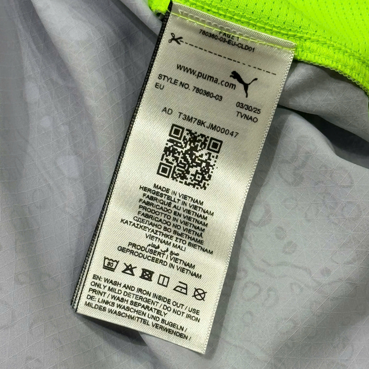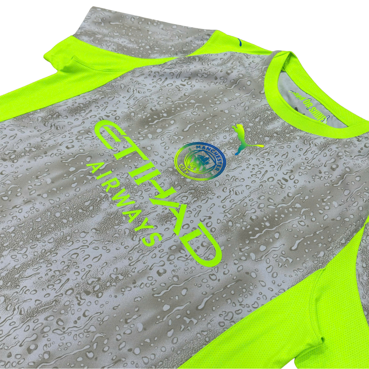 – Màu sắc & họa tiết: Màu nền “Cool Weather” – xám lạnh, kết hợp với chi tiết “Pro Green” – neon xanh nổi bật ở vai, cổ, logo và các điểm nhấn. Họa tiết toàn thân dạng giọt mưa (raindrop graphic) tạo cảm giác “ẩm ướt” như khung cửa sổ mưa Manchester.