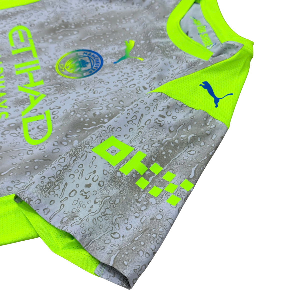 – Thiết kế: Áo sân thứ ba mùa 2025/26 của Manchester City do PUMA hợp tác sản xuất, lấy cảm hứng từ bầu trời xám và những giọt mưa đặc trưng của Manchester.