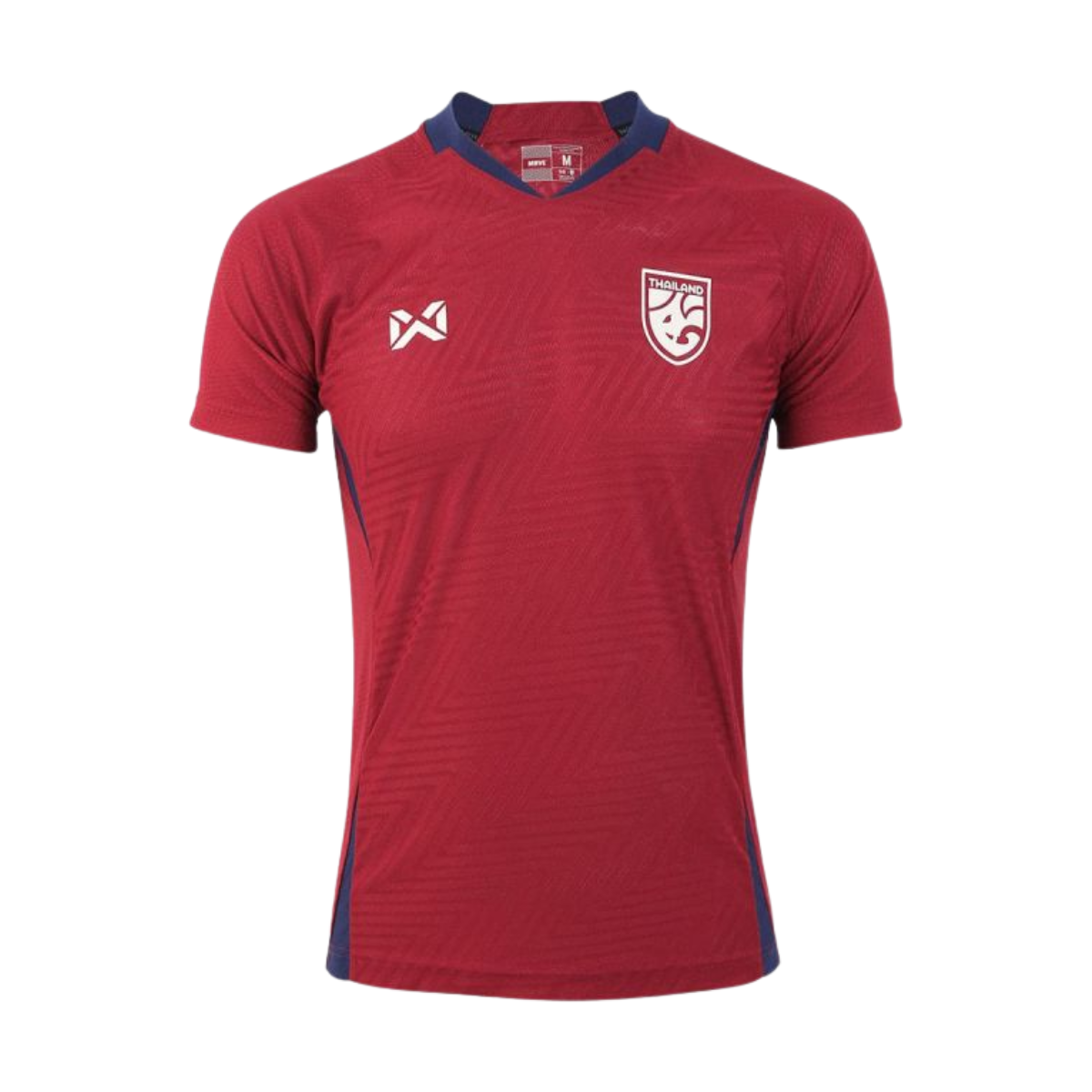Logo Warrix màu ivory/sáng ở ngực phải, logo “Changsuek” (biểu tượng đội tuyển Thái) ở ngực trái.