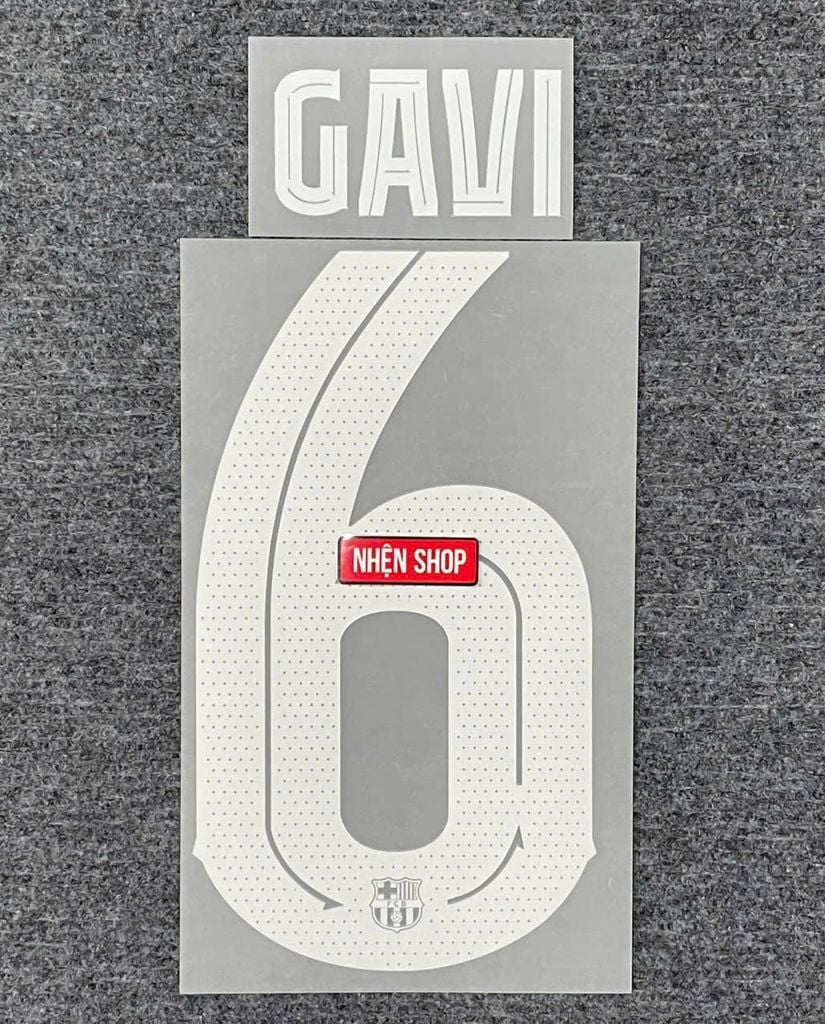 Bộ nameset GAVI 6 chính hãng Sporting ID cho áo sân nhà Barcelona mùa 2023/24. Thiết kế chuẩn font CUP, mỏng nhẹ, sắc nét, bám vải chắc, bền màu – đúng chuẩn thi đấu.
